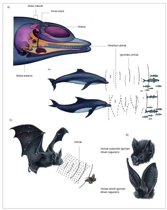LABURPENA: Oso espezializazio desberdinak daude animalien artean inguruneko estimuluak jasotzerakoan. Ikusmena, entzumena, dastamena, usaimena eta ukimena, gizakiaren berezko zentzumenak izan arren, ez dira animalia guztietan aurkitzen, ezta gizakian duten indar berarekin ere. Bestalde, animalia mota batzuk gauza dira guretzat entzun ezinezkoak diren hotsak entzuteko, edota zenbait estimulu elektriko, magnetiko, izpi infragorri (beroa), edo uraren edo airearen mugimenduak jasotzeko. Nabarmentzekoa da, horien artean, zenbait animaliak oihartzunaren bidez orientatzeko eta harrapakinak aurkitzeko duten ahalmena.