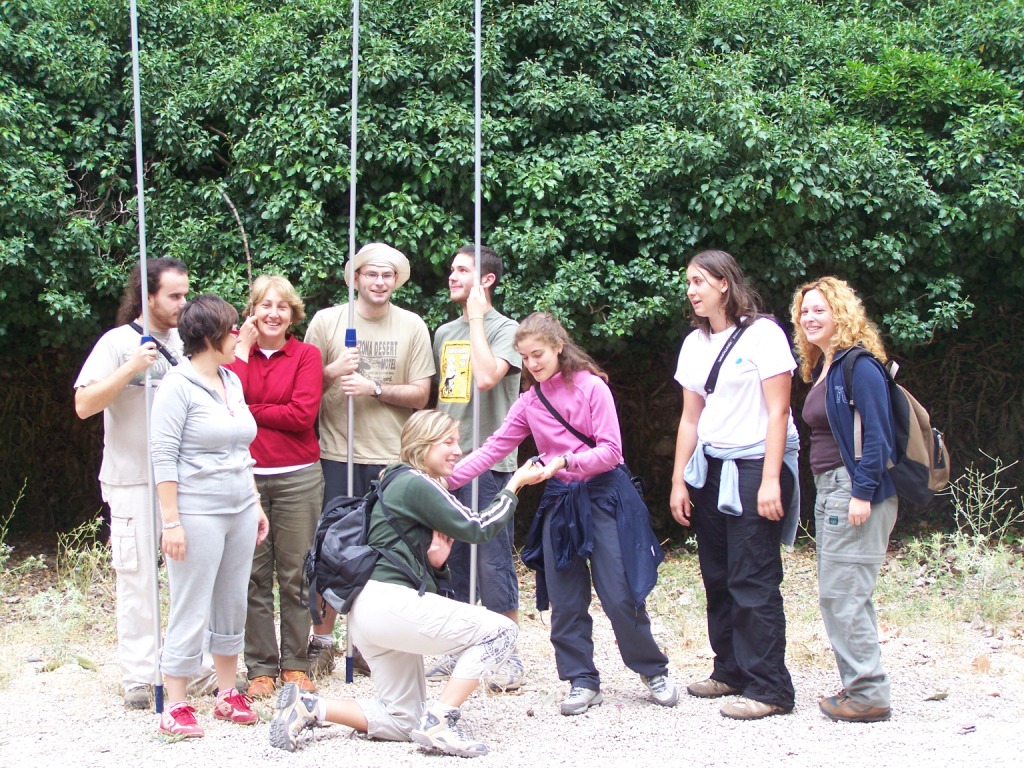 Poteo intercultural. No todo iba a ser trabajar. En la foto posamos un pequeño grupo desde la verbena de Caspe. Hay gente de Huelva, Castellón, Murcia, Francia, Repulica Checa, Polonia, Mexico y Euskadi.