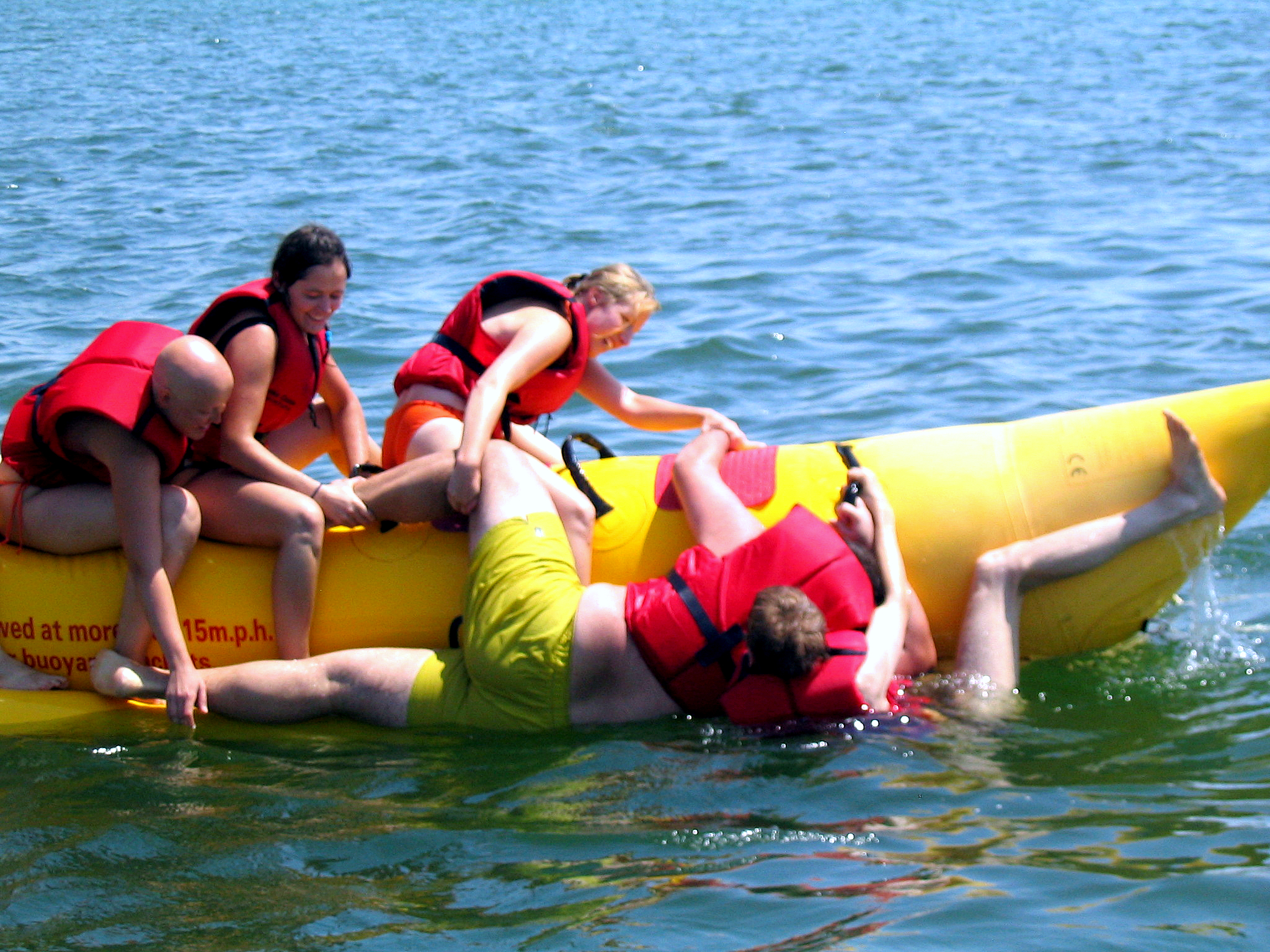 Banana: misión imposible. En una de las actividades acuáticas mis compañeros demostraron gran capacidad de trabajo en equipo para intentar subirme en la banana. Al final no pudo ser pero pasamos un buen rato, jeje.