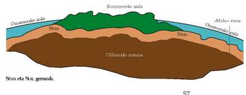 Kontinenteko eta ozeanoetako azalaren eta mantuaren arteko mugari “Mohorovicicen etena” esaten zaio, eta oso loditasun desberdina du leku batzuetan eta besteetan.