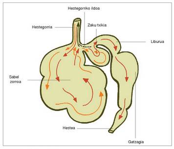 Gero, oraindik txegosi ez den janari hori ahora bidaltzen dute han mastekatzeko (hausnartzea), ahotik zaku txikira itzultzen da berriz ere, eta, handik, liburura eta gatzagira gero. Gatzagia da, izan, benetako urdaila (hestegorriaren luzakin gisakoak dira beste atalak), eta han egiten da txegoste kimikoa.