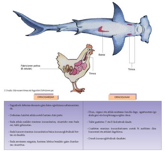 Ornodunei dagokienez, funtsean haietan guztietan agertzen dira osagai inmunologiko guztiak eta plan berari jarraitzen diote gainera: T eta B linfozitoak arrain agnatoetan beretan agertzen dira, eta CMH konplexua hezur-arrainetan. Organo linfoideak eta hezurretako muina ere talde guztietan ageri dira, salbuespenen bat izan ezik (arrainek ez dute hezurretako muinik ez gongoilik).
