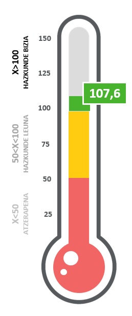 Euskal ekonomiaren termometroak 107,6ko balioa izan zuen azaroan. Horrela, euskal ekonomiak azken hilabeteetako joera positiboa luzatu du, nahiz eta jardueren artean sakabanatze handiagoa egon. Eskariari dagokionez, kontsumo pribatuak aurrerapen nabarmena du, eta inbertsioa da osagairik dinamikoena, eta jarduera bultzatzen jarraitzen du. Kanpo arloak ekarpen negatiboa egiten jarraitzen du, baina intentsitate txikiagoarekin. Eskaintzaren ikuspegitik, eraikuntzak eta zerbitzuek portaera bereziki ona dute, eta industriak, berriz, oso modu moderatuan egiten du aurrera.