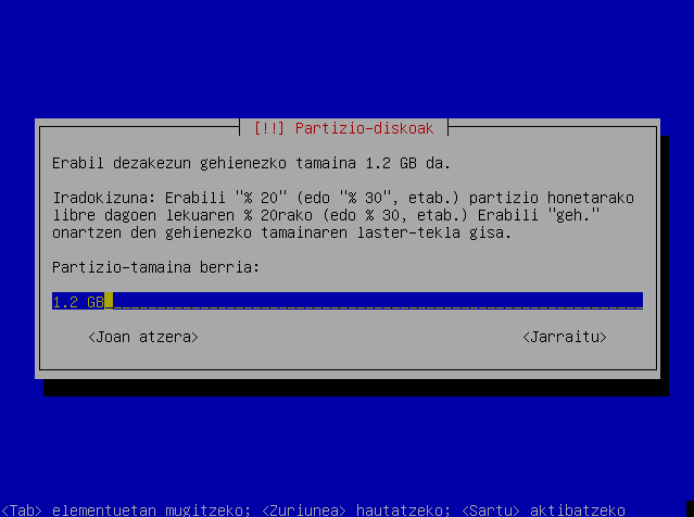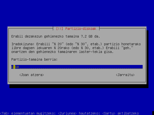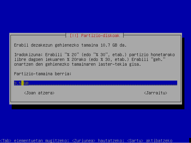 Hautatu partizio berriaren tamaina.