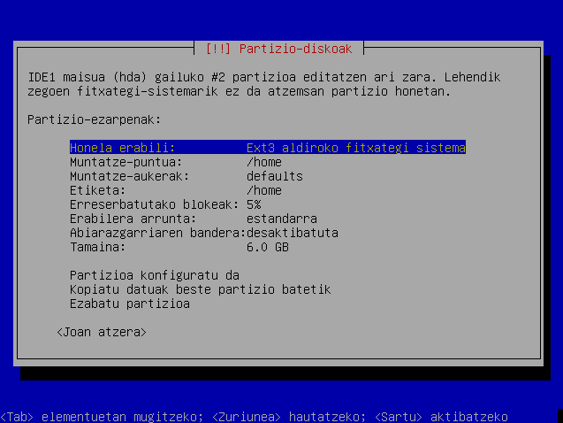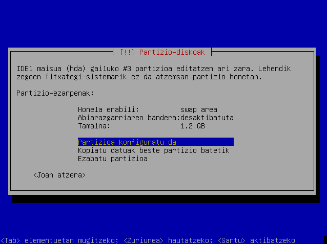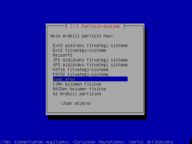 Hautatu "Swap area" eta sakatu Sartu. Ondoren hautatu "Partizioa konfiguratu da"