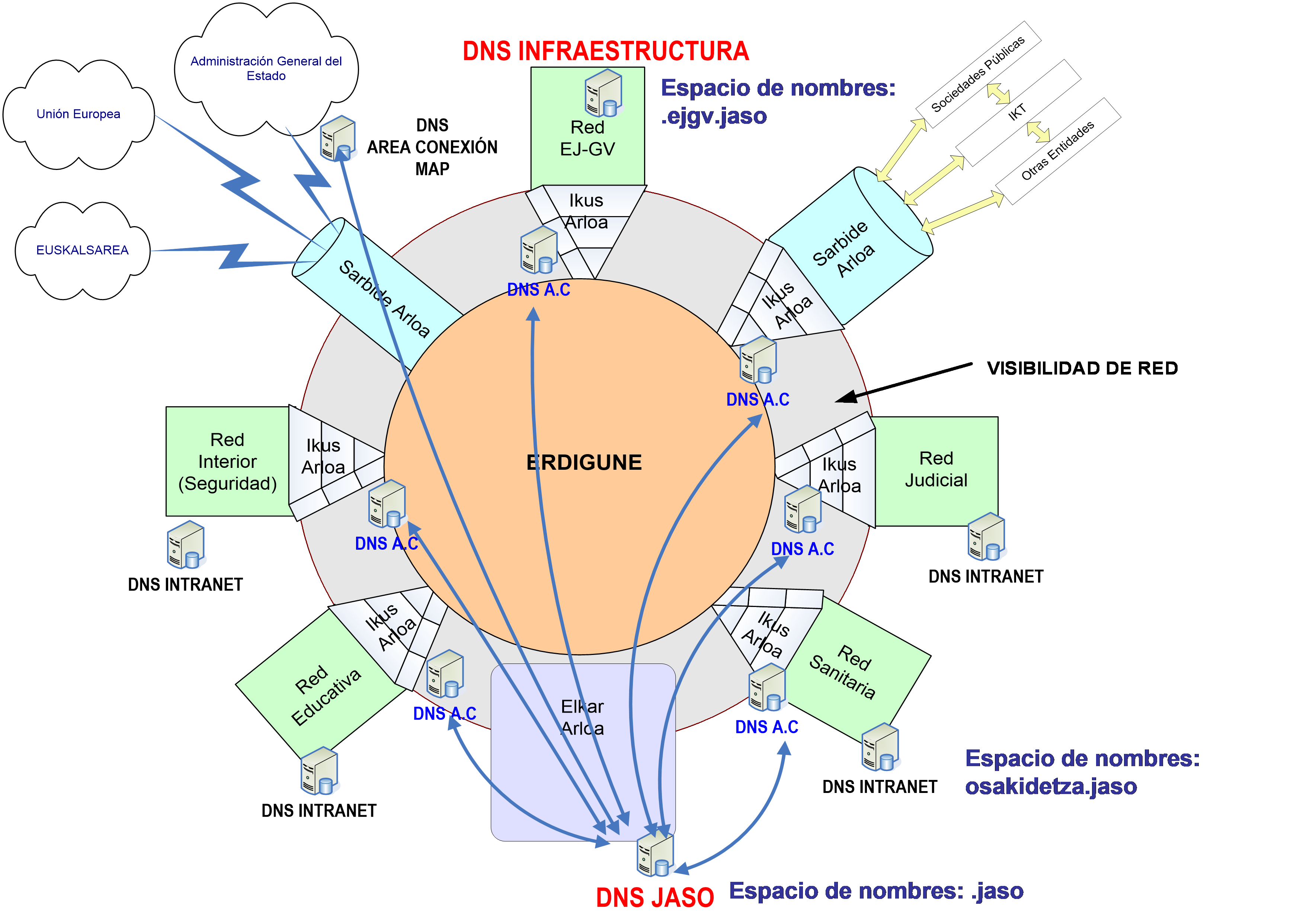 Los DNS internos deberán tener definidos un «Forward Zone» al DNS de JASO para todo el espacio de nombres de JASO .euskalsarea..eus (salvo para el espacio de nombres que resuelve dicho DNS)