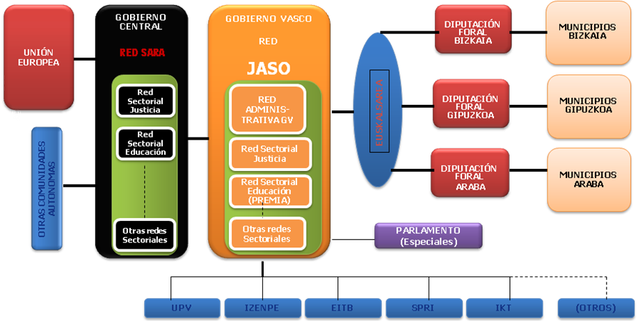 Con la conexión existente entre la Red Corporativa Administrativa del Gobierno Vasco y la red SARA de la Administración General del Estado, automáticamente todas las redes que conforman JASO están conectadas a dicha red y por lo tanto disponen de conectividad con otras redes: