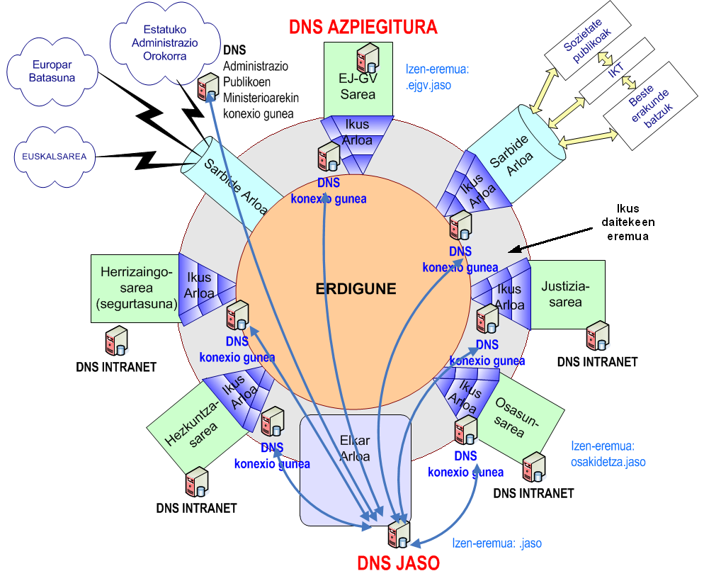 Barne-DNS bakoitzak erreplika sortzen du Jasoren DNS zerbitzariarekin kudeatzen duen izen-eremurako (Elkar Arloan egongo da zerbitzari hori). Hala, Elkar Arloa eremuko DNSa izango da hemen proposatzen diren JASOko izen-eremu guztietarako DNS orokorra.