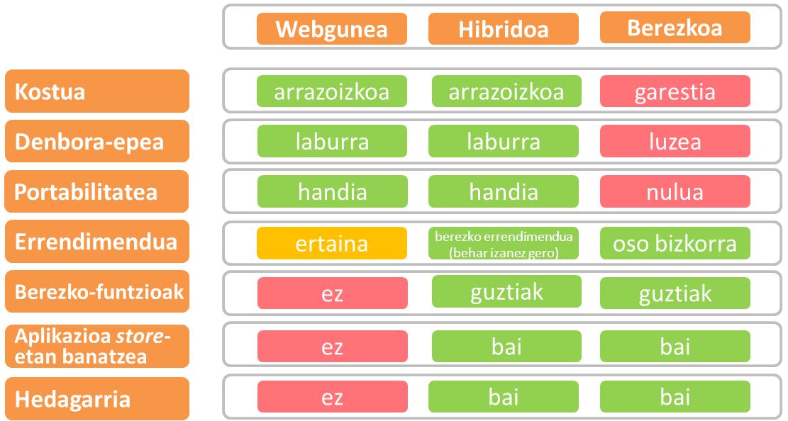 - Web-lengoaia batean oinarritutako garapena (C#, Java, Javascript, C++, etab.), dagokion sistema eragilearen (Windows Phone, Android, iOS, Blackberry OS, etab.) hizkuntzan jasota geratuko dena