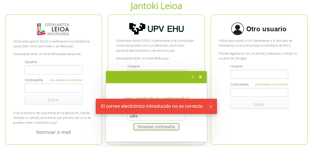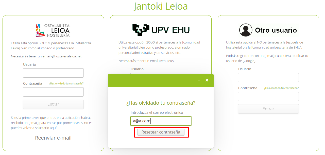 Introducir el correo electrónico y pulsar “Resetear contraseña”.