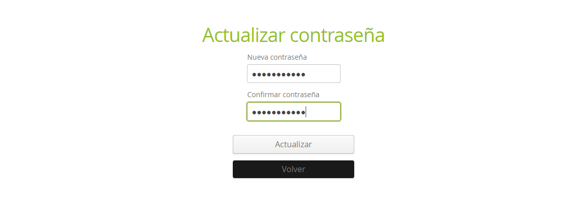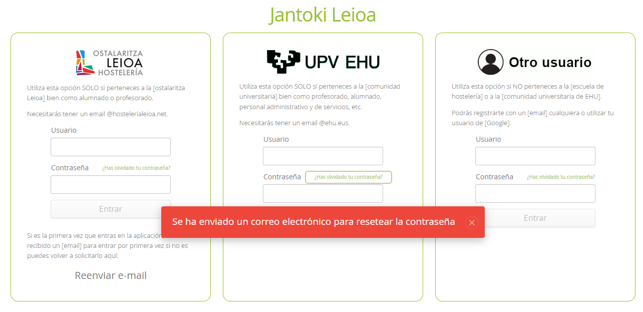 Introducir ambas contraseñas y pulsar “Actualizar”. Se redirijira a la aplicación de Ostalaritza Leioa para acceder nuevamente.