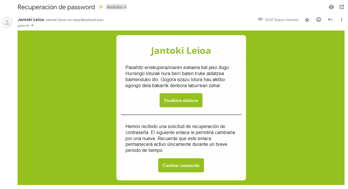 Se recibe un correo a la dirección indicada, pulsar “Cambio contraseña”.