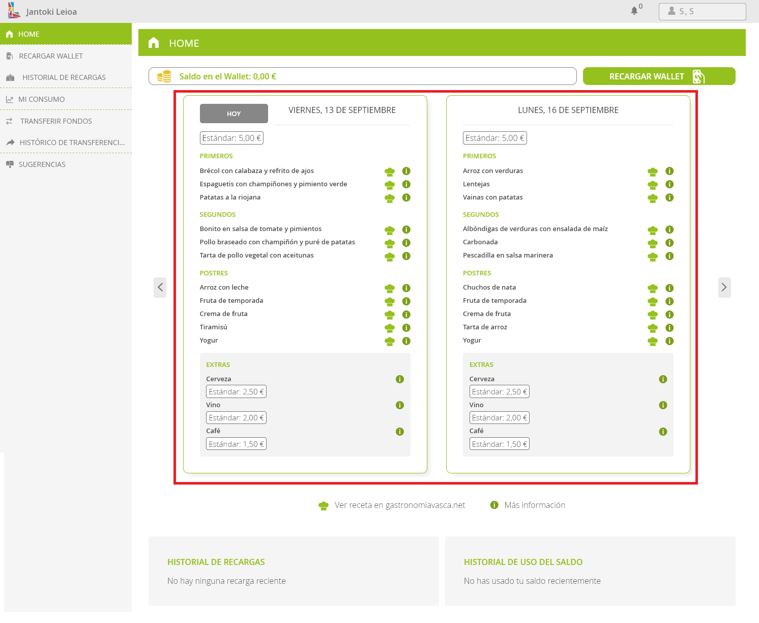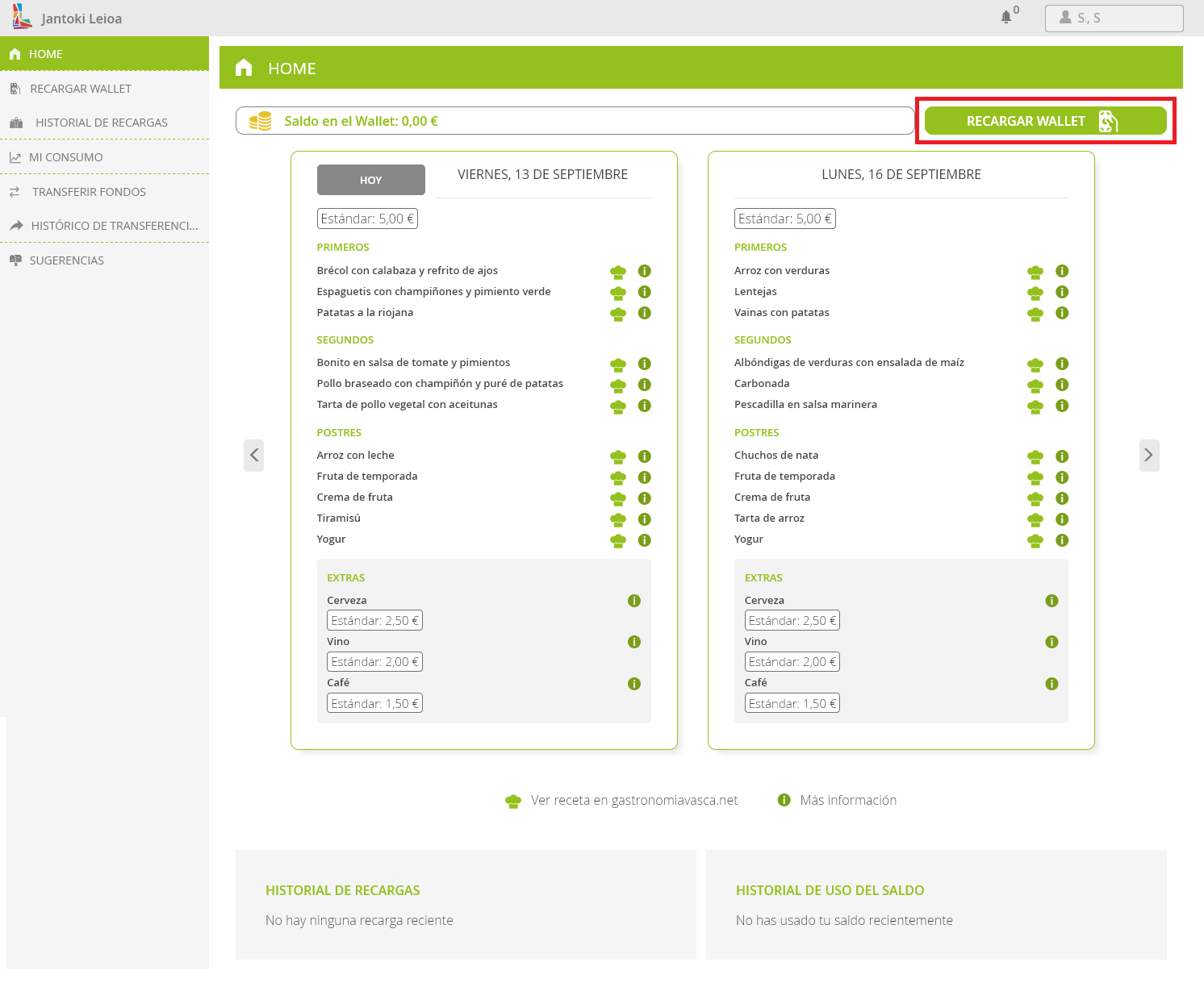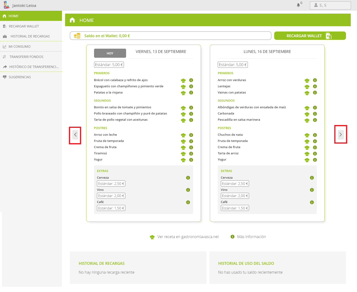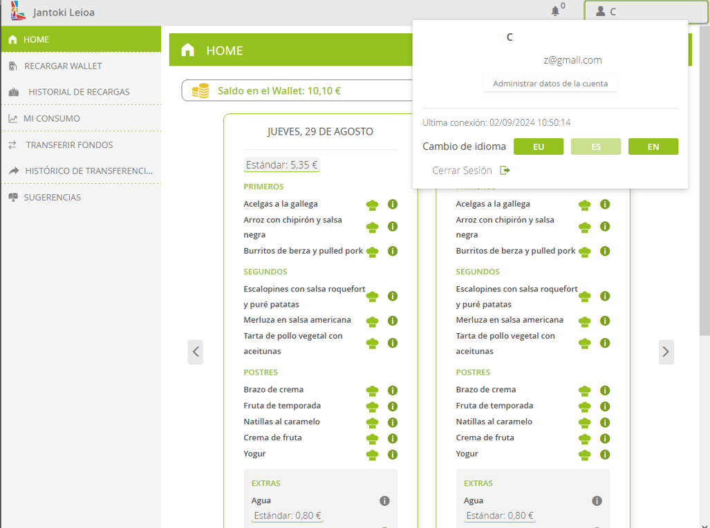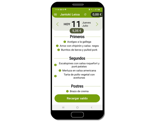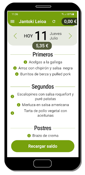 Por lo tanto, el primer paso es cargar el wallet con algo de dinero. Esta carga se puede hacer tanto en la app móvil como en el navegador web en https://www.euskadi.eus/ostalaritza-leioa