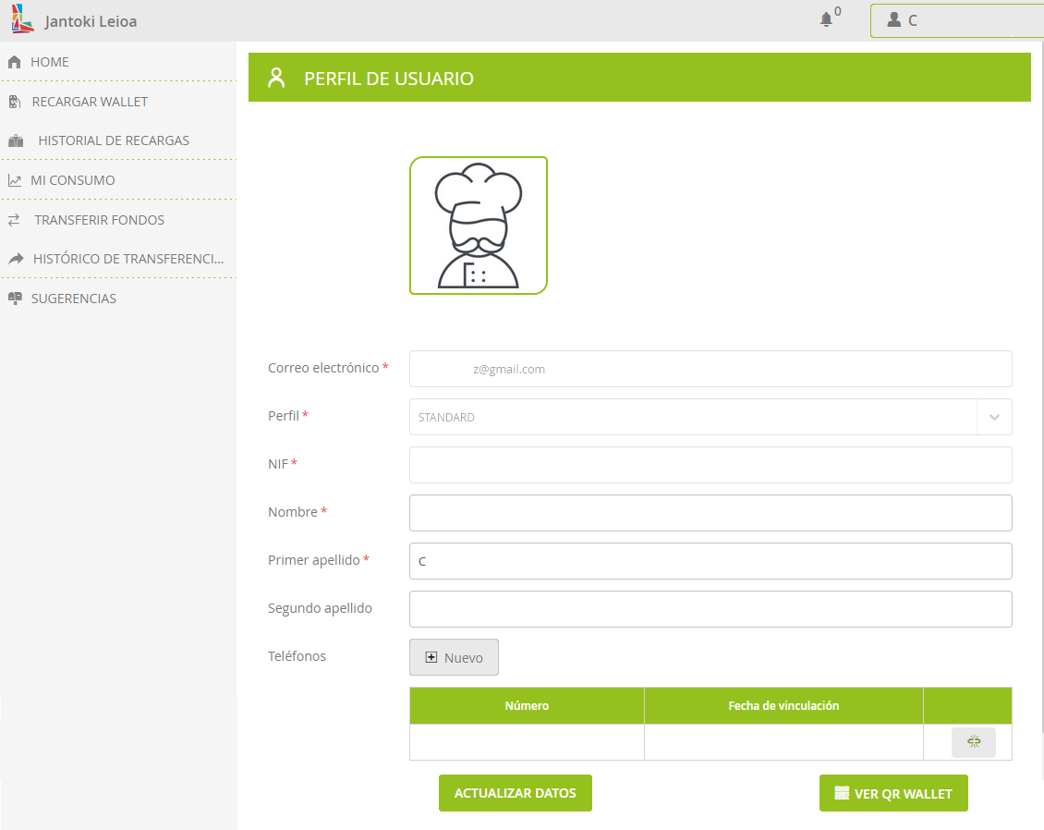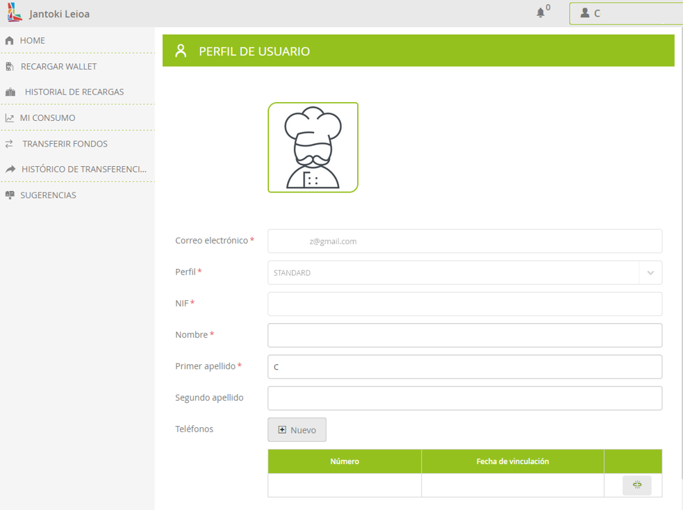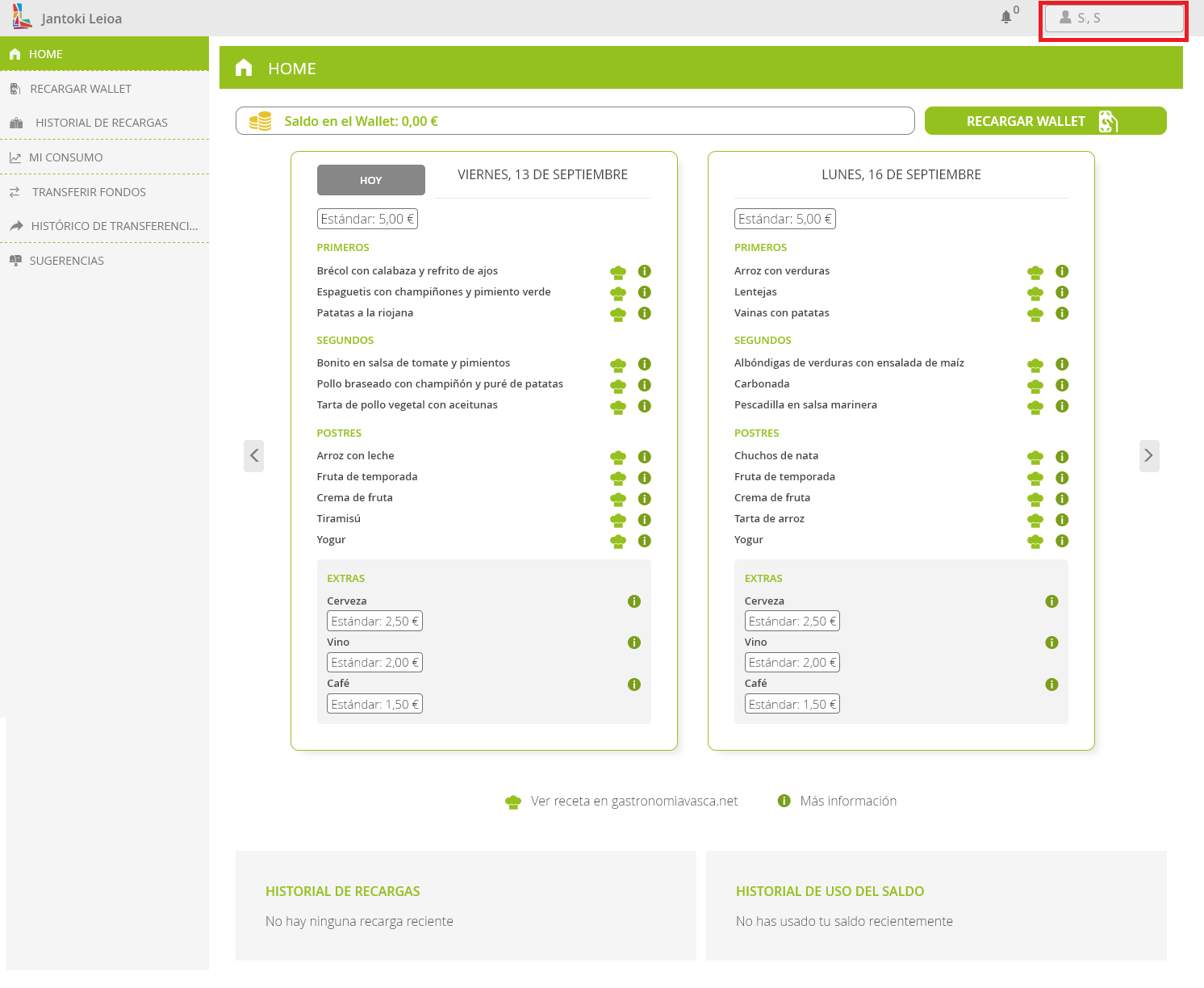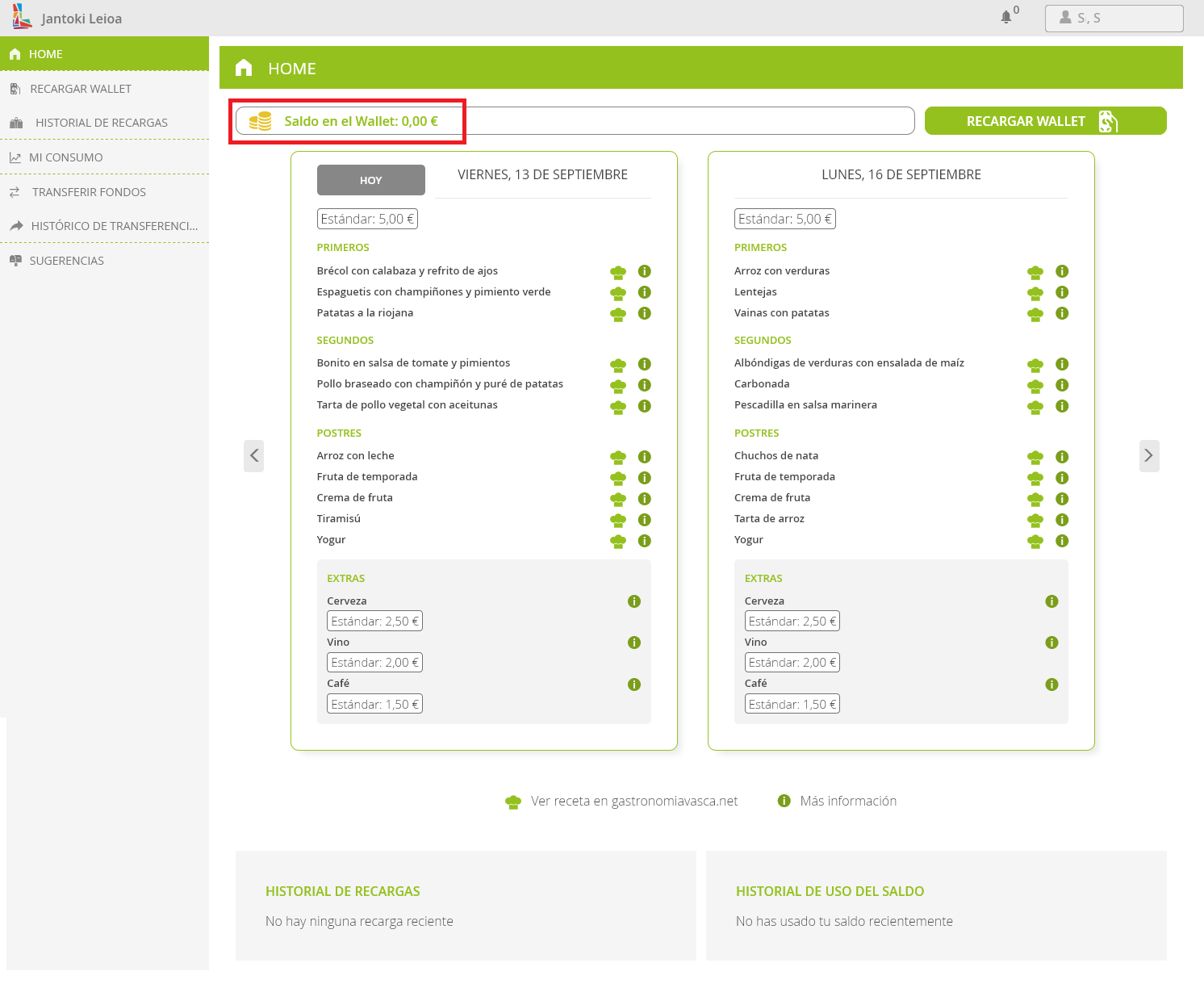Por lo tanto, el primer paso es cargar el wallet con algo de dinero. Esta carga se puede hacer tanto en la app móvil como en el navegador web en https://www.euskadi.eus/ostalaritza-leioa