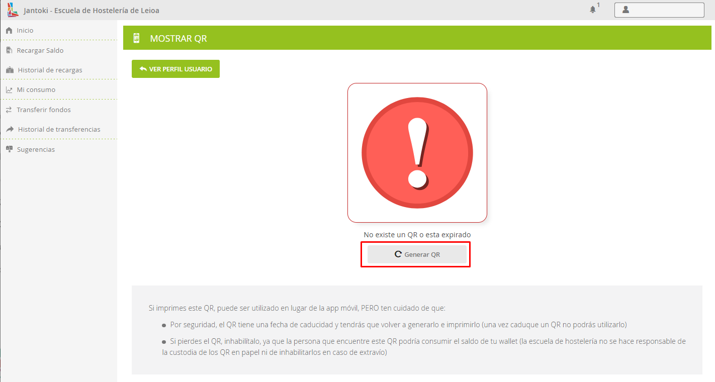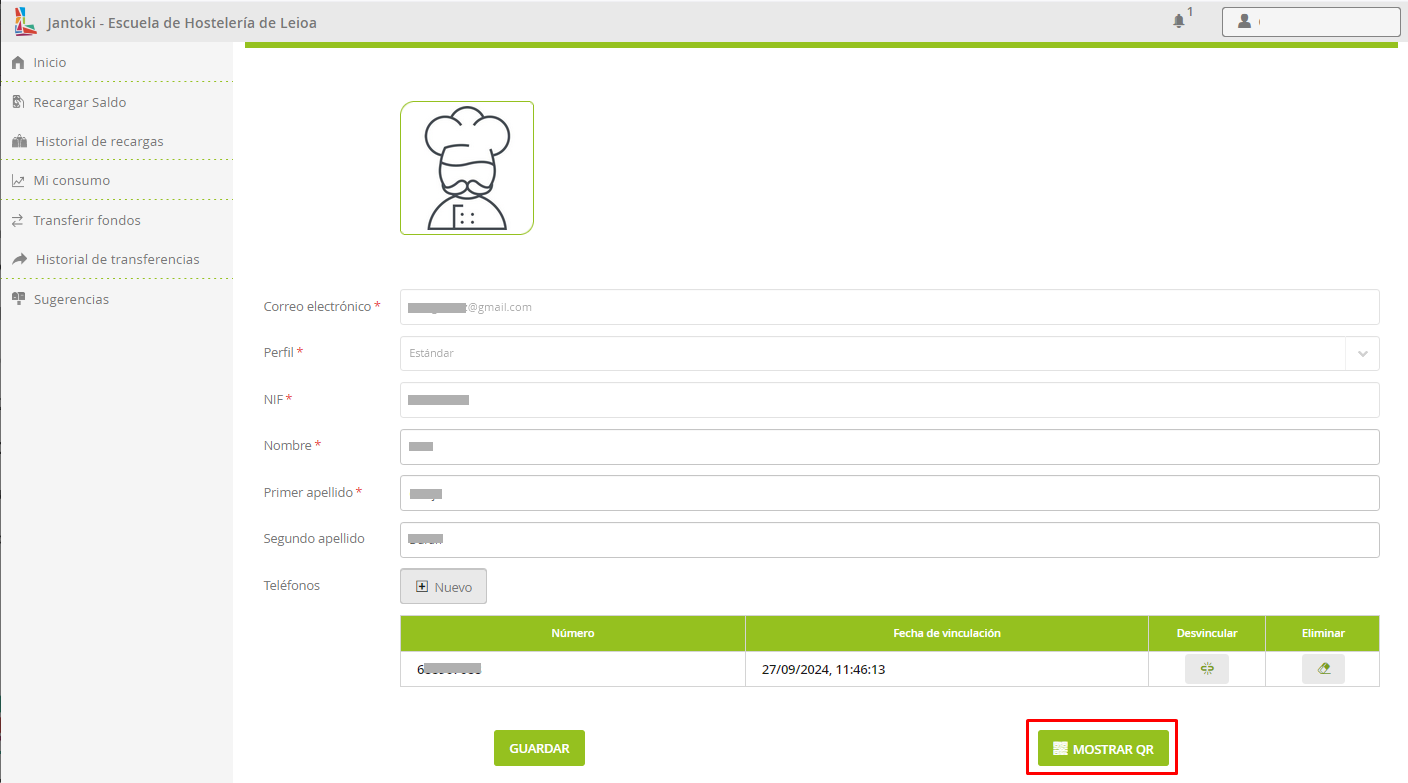 Mostrar en el comedor el QR personal para hacer uso del saldo.