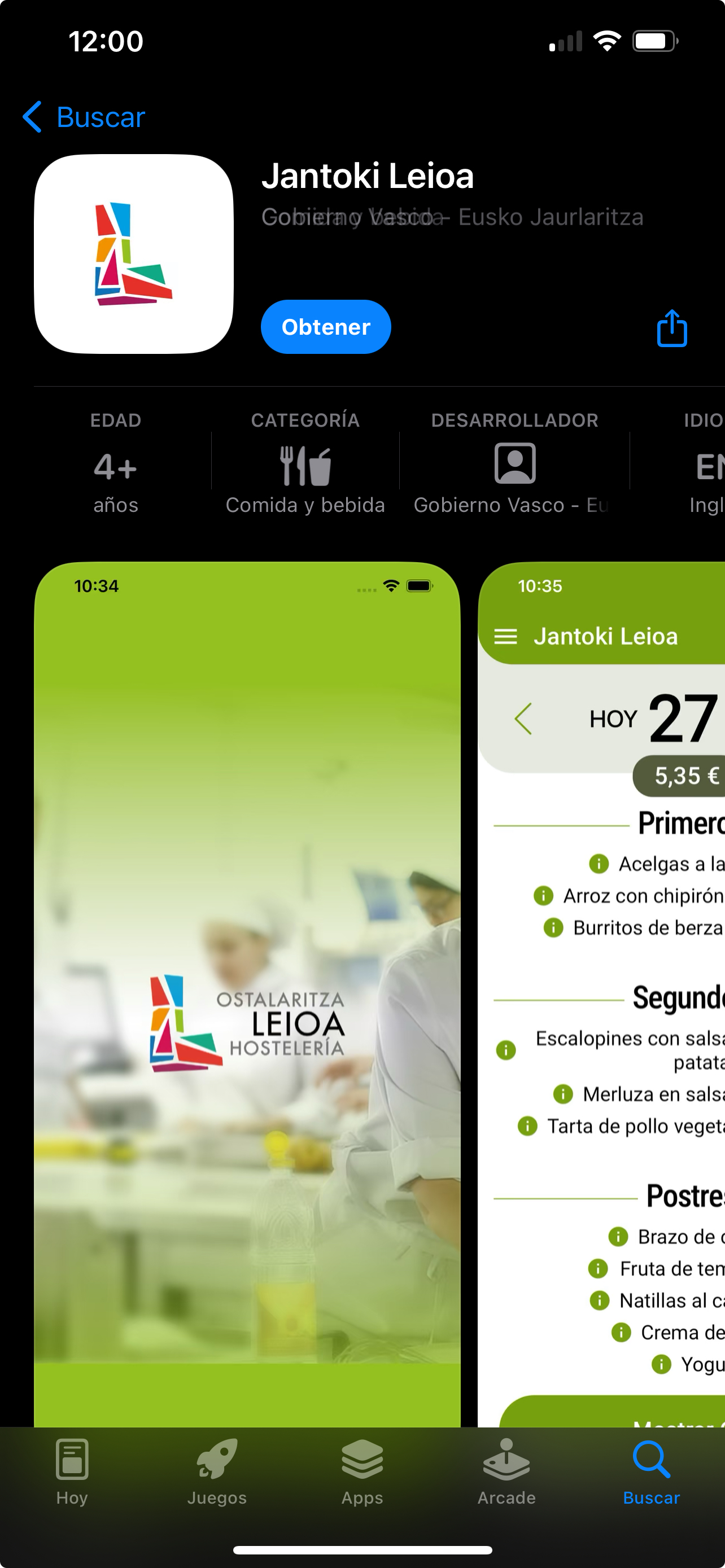 Se ha accedido a la aplicación de Ostalaritza Leioa en la que se observan los menús.
