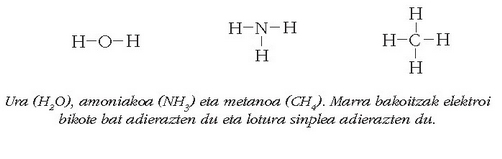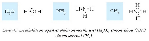 Zenbait molekularen egitura elektronikoak: ura (H2O), amoniakoa (NH3) eta metanoa (CH4).