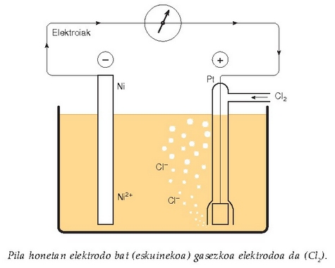 Ondoko irudian, elektrodo bat nikelezkoa eta bestea klorozkoa dituen Daniell-en pila ikus daiteke. Nikela metal gotorra da, elektrodo normala beraz; bestea berriz, gasezko elektrodoa da bere osagai nagusia kloroa delako.