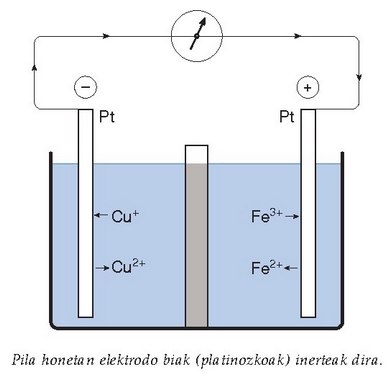 Galvaniren pila baten bitartez bereizten dira fisikoki esandako erreakzioko erdi erreakzioak (ikus irudia).