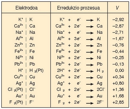 Ondoko taulan zenbait elementuren erredukzio-potentzial normalak ematen dira. Zeinu negatiboak adierazten du erredukzio-erreakzioa ez dela berez gertatzen, alderantzizko erreakzioa baizik. Zenbat eta handiago izan erredukzio-potentziala, orduan eta handiagoa izango da elektrodoaren erreduzitzeko joera, hau da, oxidazioa eragiteko ahalmen handiagoa izango du. Fluoroari dagokio taulan baliorik handiena eta potasioari txikiena. Fluoroa erraz erreduzitzen den bitartean potasioari asko kostako zaio.