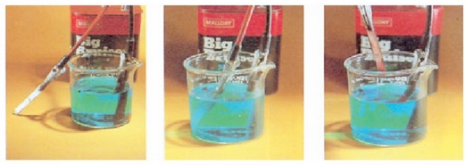 Irudiko ontzian kobre sulfatozko disoluzio bat dago, eta disoluzioan murgilduta grafitozko elektrodo bat. Ontzitik kanpo zilarrezko elektrodo zuria ikus daiteke. Bigarren irudian elektrodo biak disoluzioan sartuta ikusten dira. Hirugarrenean, berriz, zilarrezko elektrodoa disoluziotik kanpora dago, kobrez estalita (kolore gorrixka) elektrolisiaren ondorioz.