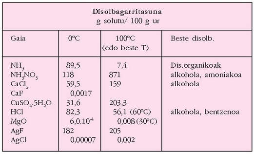 Ondorengo taulan, zenbait gaik, uretan, beste disolbatzaile batzuetan, eta tenperatura desberdinetan duten disolbagarritasuna agertzen da.