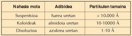 Disoluzio bat nahaste homogeneo bat dela esaten da. Nolanahi ere, bi osagai, edozein, elkarrekin nahastean, gerta daiteke nahaste homogeneo bat eratzea, edo ez eratzea. Suspentsioen kasuan, berriz, nahastea ez da homogeneoa, eta irabiatu ondoren bi faseak elkarrekin nahasten badira ere, osagaietako bat nola jalkitzen den ikus daiteke. Ura eta harea nahastean, adibidez, argi ikusten da hori. Bada ordea bi kasu horien tarteko beste bat: koloideena, hain zuzen ere. Suspentsioa, koloidea eta disoluzioa nahasteko partikulen tamainaren arabera bereizten dira.