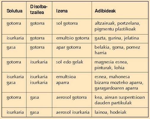 Koloide motak eta adibideak: