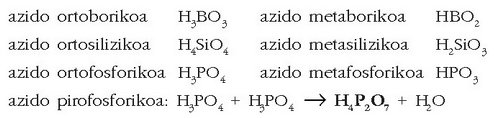 Badaude oxiazidoen artean ur molekula bat baino gehiago onar - tzen dutenak, nagusiki, fosforoa, silizioa, teluroa… Kasu honetan zenbat molekula ur hartu dituen adierazteko meta-, piro- eta ortoaurrizkiak erabiltzen dira (1, 2 edo 3 molekula ur):