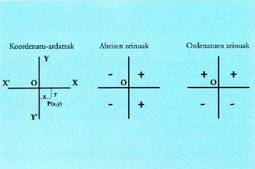 Bestalde, abzisa-ardatzetik punturainoko distantziari ordenatu deitzen zaio eta "y" letraz adierazten da. Puntu bakoitzaren abzisa eta ordenatuak osatzen duten multzoari (x,y), koordenatu cartesiar deitzen zaio. Koordenatu horiek, positiboak ala negatiboak izan daitezke. Puntu baten abzisa positiboa dela esango da ordenatu-ardatzaren eskuinaldean badago, eta negatiboa dela, haren ezkerraldean badago. Ordenatua positiboa dela esango da puntua abzisa-ardatzaren gainean badago, eta negatiboa dela, haren azpian badago. Hobeto ulertzeko, ikus irudia.