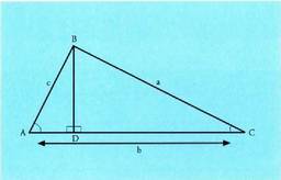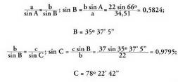 Irudiko triangeluan, adibidez, "a" aldea eta A eta C angeluak ezagutzen dira.B angelua kalkulatzen da 180°ko balioari A eta C angeluen balioa kenduta. B = 180 0 - ( A + C) eta XVII.2 atalean ikusia denez, sin B = sin (A + C).Sinuen teorema erabiliz, "b" kalkulatzen da :