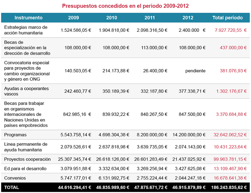 A pesar de que en el año 2012 los presupuestos generales de la Administración Vasca fueron recortados respecto a 2011, el presupuesto en cooperación ha alcanzado los 46.915.879,89 €.