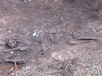 - Informe de exhumaciónDe esta manera, a solicitud del Ayuntamiento de Zaldibia y a fin de responder a la solicitud de este vecino de Zaldibia, da comienzo la excavación el día 09/09/2002, que se prolonga a lo largo de tres días. Fruto de esta intervención se exhuman los cuerpos de dos individuos de identidad desconocida, ambos presentan sendos orificios de arma de fuego en el cráneo. No obstante, no se ha encontrado ningún proyectil durante la excavación. Junto con los cuerpos han sido localizados diferentes objetos metálicos.