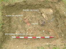 - Informe de exhumaciónEl día 11/06/2011 se lleva a cabo la intervención, en la que se recuperaron los restos de un esqueleto humano a escasos centímetros de profundidad. Los restos se presentan en mal estado de conservación ya que han sido afectados por la acidez del agua de la lluvia y las raíces de la cubierta vegetal. Asimismo se recuperó un fragmento de cinturón de cuero de 35 mm de anchura sin hebilla, además de numerosos elementos balísticos hallados en la inmediata proximidad.Existe una grabación en video de la intervención