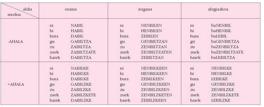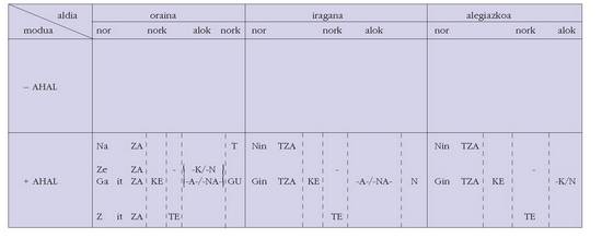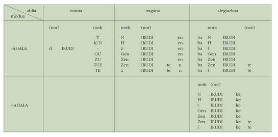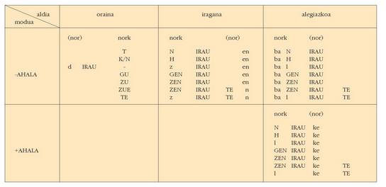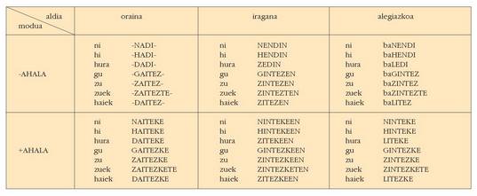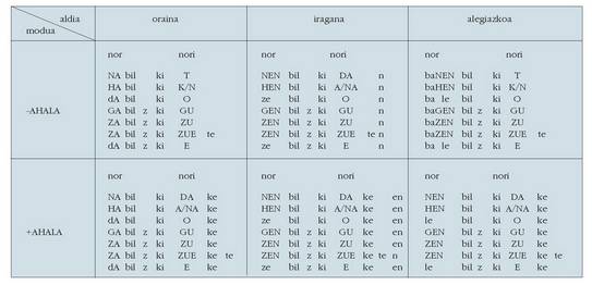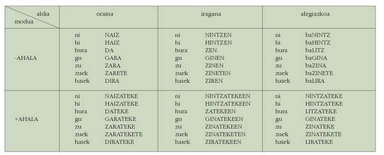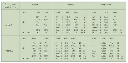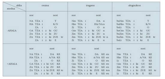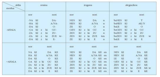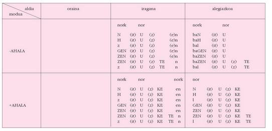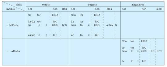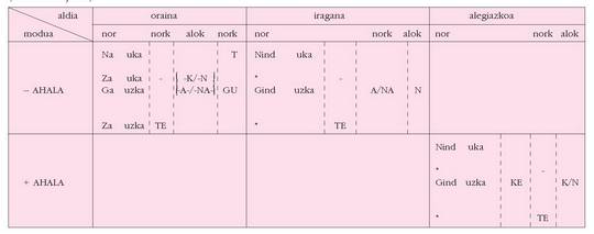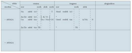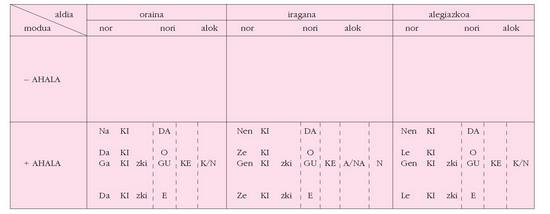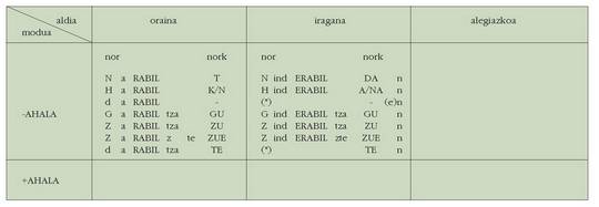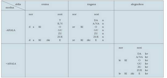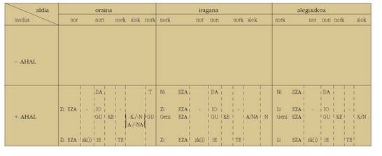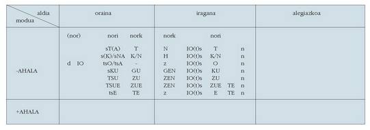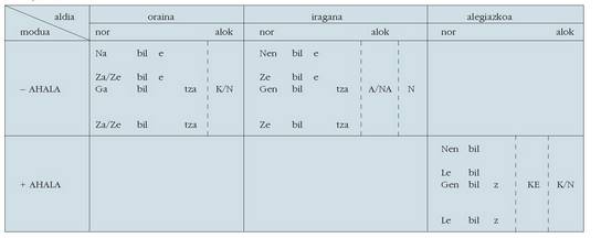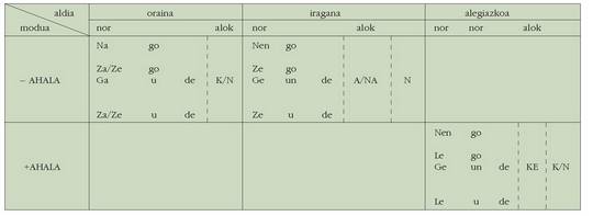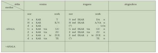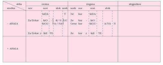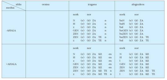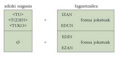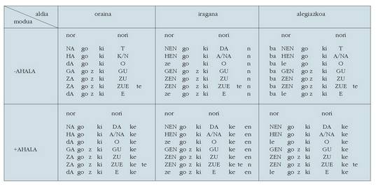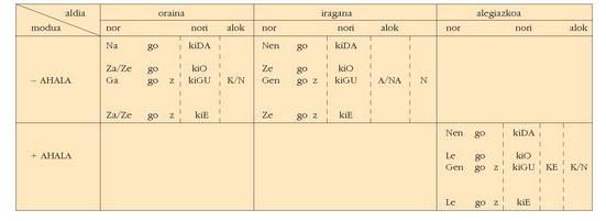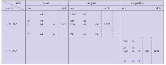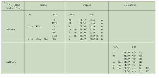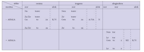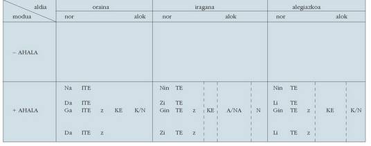 ohar egitea:1. Koadro hauetan ez dira biltzen Euskaltzaindiak onartutako adizki