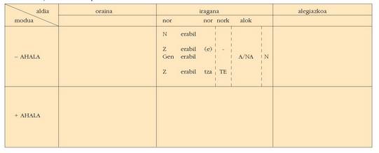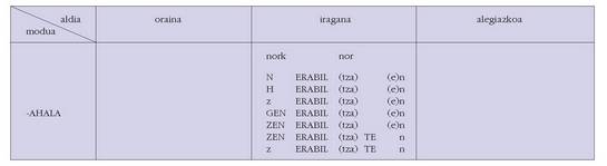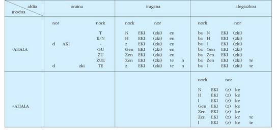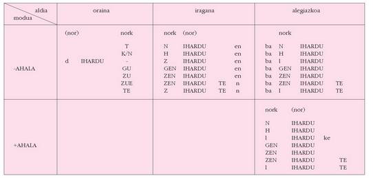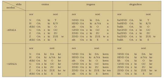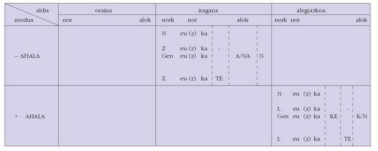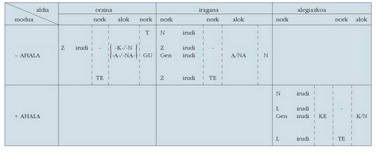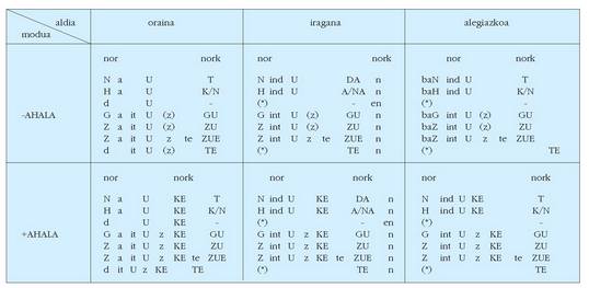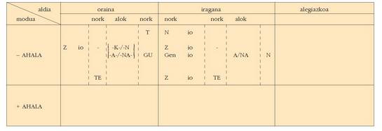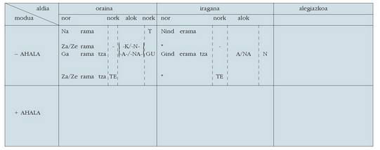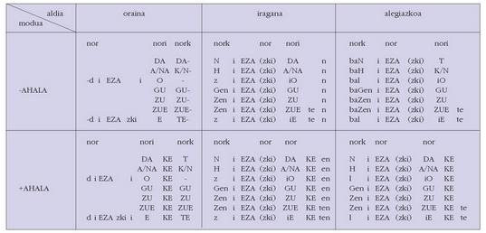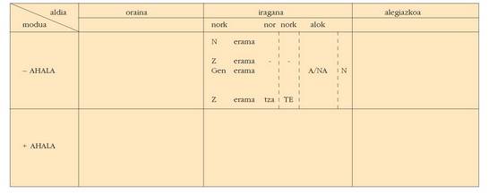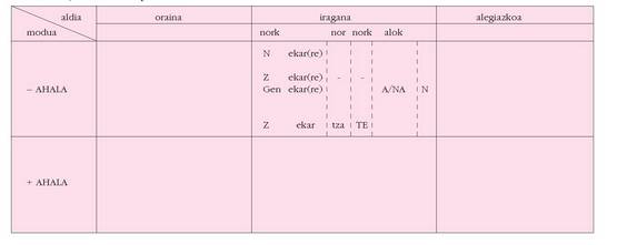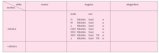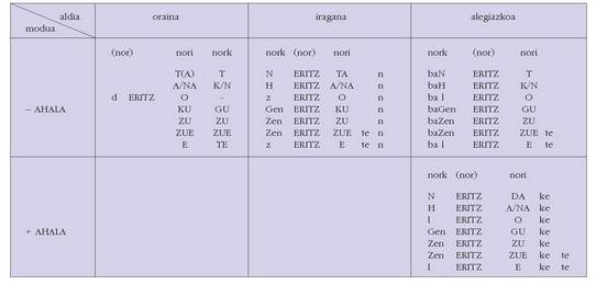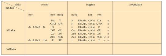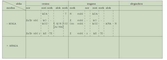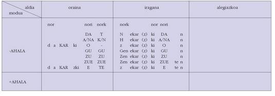 sortu. Hau alokutibo ez diren adizkietan ere betetzen da.4. Hala ere, zenbait koadrotan, nork-entzat adibidez, bi zutabe