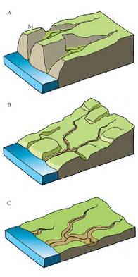 Lurraren gainaldearen higadura nola gertatzen den gaztaroan (A), helduaroan (B) eta zahartzaroan (C).<br><br>