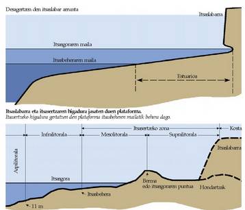 Kostaldearen alde batzuen eta besteen artean gertatzen den gorabehera hori gune infralitoralean plataforma kontinentalak duen makurduraren ondorioz gertatzen da.