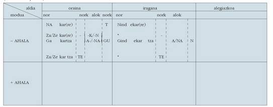 sortu. Hau alokutibo ez diren adizkietan ere betetzen da.4. Hala ere, zenbait koadrotan, nork-entzat adibidez, bi zutabe