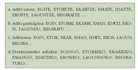 diren marka edo morfema desberdinak banan banan aurkeztea.