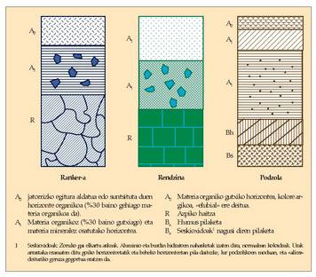 Sustantzia horiek biak eraldatu gabeko haitzaren gainean banatzen dira, horizonte deitu ohi diren geruza batzuetan.