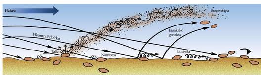 Airearen turbulentziek lur azaleko materialak mugitzen dituzte, materialen tamainaren arabera betiere. Zenbait esperimenturen bidez frogatu ahal izan da hondar fina eta tamaina ertaineko hondarra errazago higitzen dela. Haizeak hamabost metro segundoko lastertasuna hartzen duenean hasten da higitzen tamaina horretako hondarra, eta lur azaletik hamabost zentimetrotara igoarazten du. Limo zatiki finak, 0,025 milimetro baino diametro txikiagokoak, zailak dira mugitzen; dena dela, zatiki fin horiek mugi daitezke, baina bakarrik zatiki handiagoek lur azalaren kontra talka egin eta lurreko hauts fin pixka bat zipriztintzen badute haize lasterraren barruan. Legarra bezalako material lodia, aldiz, hamasei metro segundotik gorako lastertasuna duen haizeak ere ezin mugi dezake, normalean.