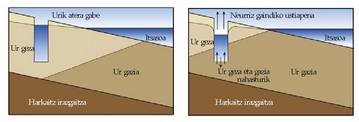 Urak, beraz, geruza irazgaitzaren alderdi beherakoenetan metatzeko joera du, eta han akuifero libre bat eratzen du, ekarri berriek eta azal horizontalekoek etengabe hornitzen dutena. Akuifero itxi ez horizontal batean, aldiz, ur ekarriak osorik beteko du eremua, ura alboetarantz igoaraziko du, eta, desnibelaren ondorio gisa, presio hidrostatikoa sortuko du.