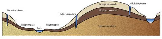 Hala ere, beste parte bat (lehena bezain garrantzitsua edo garrantzitsuagoa agian), ura doan materialak, porotsua edo apurtua izanik, uzten duen neurrian, zirrikitu edo arrailduretatik sartzen da, eta lur barrenera jaisten da, geruza irazgaitz bat aurkitzen duen arte.