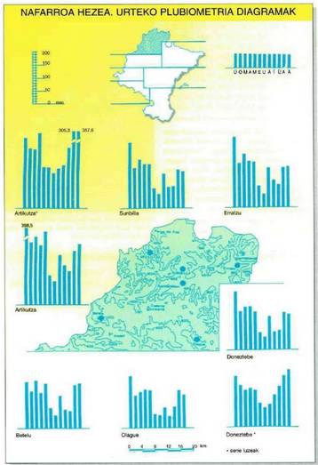 Plubiometria indizerik apalena udan izaten da (56 mm Iratxen, 46,6 Esan, 60 mm Iruñean eta 67,8 mm Gasteizen), baina ez da lehorterik izaten, salbu eta zenbait hilabete lehor dituzten Nafarroako ekialdean eta hegoaldeko guneetan: Esan, Iratxen eta Lizarran.Udazkenean, prezipitazioak ugaritu egiten dira (%26,la jasotzen da Gasteizen, %27,7a Iruñean eta %30a Iratxen), fronte polarra latitude apalagoetara jaisten dela eta, eta eguraldi motek neguko ezaugarriak izan ditzakete. Udaberrian ere gauza beretsua gertatzen da, Iberiako penintsulako antizikloiaren eragina ahuldu egiten delako eta egoera mediterranear eta ozeanikoak nagusitzen direlako: Gasteizek urteko ur bolumenaren %25,4a hartzen du urtaro horretan, Iruñeak %23,2a eta Iratxek %23,9a.Azpimarratzekoa da prezipitazioen urtez urteko banaketa aldakorra; urte batzuk oso lehorrak izaten dira, eta beste batzuk ohi bafcio askoz hezeagoak. Gasteizen esaterako, urteko plubiomctria indize garaiena 1.323,6 mm-koa da (1930), eta indize apalena 580,2 mm ingurukoa (1948). Dena dela, urteko ptezipitazioen batez bestekoak 650-700 eta 850-900 mm/m 2 bitartekoak izan ohi dira.Barnealdeko klima ozeanikoan egun askotan egiten du euria. Gasteizen 145 euri cgun izaten da urtean, eta 147 Iruñean; hilabete euritsuenak abendua (16,2), azaroa (14,7) eta urria (13,7) dira, eta lehorrenak uztaila eta abuztua (7,5 eta 8,1 hurrenez hurren).Tarteko Arroetako prezipitazioak 700- 1.500 mm artekoak dira, oro har. Iparmendebaleko egocrek, mendebaleko zurrunbilo bizkorrek eta Kantauri itsasoan kokaturiko ekaitzak euri asko dakarte.