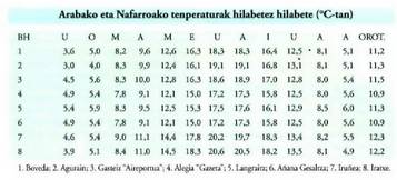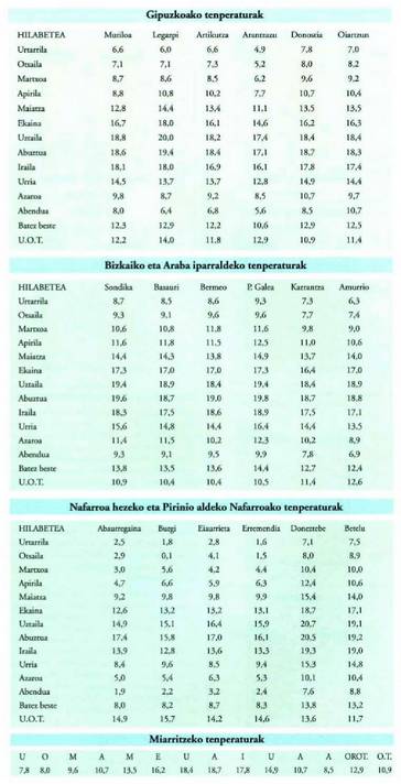 Termometroko baliorik apalenak abenduan eta urtarrilean jasotzen dira, Nafarroa hezean bereziki. Izan ere, eskualde horren altitudea garaiagoa da, kostaldea urrun dago eta behatokiak Pirinioen hegoaldeko isuraldean daude; horren ondorioz tenperatura uniforme hotzak errejistratzen dira, 0-2°C artekoak abendua eta marrxoa bitartean. Bizkaia, Gipuzkoa, Ipar Euskal Herria eta Araba iparraldea lurralde epelagoak dira; oro har hilabeteko tenperatura ez da 5°C-tik beherakoa izaten. Salbuespen bakarrak barnealdekolurraldeak edo 700-800 m-tik gorako guneak (Otzaurte, Zaitegi-Zigoiti) dira. Batez besteko tenperaturaren azterketak erakusten duenez, neguak samurrak dira eta udak gozoak. Batez besteko tenperatura garaienak udan errejistratzen dira (25-26°C kostaldean), 33,2°C inguru uztailean eta 35,2°C abuztuan. Tenperatura absolutu garaienak ere urtaro honi dagozkio; batzuetan 40°Ctik gora egiten du. Afrika aldetik iristen diren aire tropikal kontinentalen edo itsasoko aire tropikalek sortu ohi dituzten beroaldien ondorio dira tenperatura garai horiek: 40,2°C Bilbon, 38,6 Q C Donostian, 38,7'C Miarritzen eta 34,3°C Amurrion.Tenperatura absolutu apalenak (-12°C, 1957ko urtarrilaren 17an Igeldoko behatokiak), berriz, aire masa kontinental oso hotz eta lehorren ondorio dira. Tenperatura absolutu apalenen batez bestekoak 0 azpitikoak dira azaroan, abenduan, otsailean eta martxoan (-5°C-tik azpitikoak ere bai zenbait tokitan). Araba iparraldean -7°C-tik beherakoak ere izan daitezke. Dena dela, gunerik hotzena Nafarroa iparraldea da: marka guztiak urratzen dira han, -12°C-tik beherako tenperaturekin.
