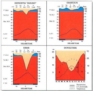 Uriarteren arabera (1982), 1961-1980 bitartean 14 aldiz izan ziren 100 baino prezipitazio ordu gehiago (lau aldiz apirilean eta beste lau azaroan), eta 24 aldiz 20 mm-tik beherako prezipitazioak: 6 uztailean, 2ekainean eta 2 abuztuan (0 azaroan, abenduan, apirilean eta maiatzean).