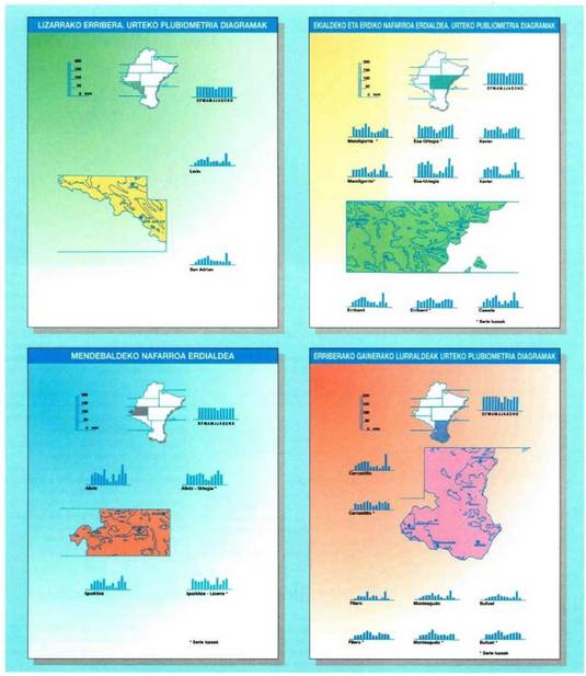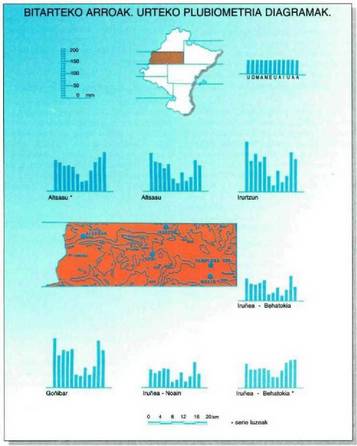 Mapa plubiomettikoa aztertuz gero, ikusten da prezipitazio gehiago izaten dela ekialdean mendebalean baino, eta hegoaldean iparraldean baino gehiago, nahiz eta erliebea den prezipitazioen banaketan zerikusi handiena duen eragilea. Eusko Jaurlaritzaren isoieta mapan (1988) plubiometria gorabehera handiak ikusten dira lurralde batzuen eta besteen artean, eta baita lurralde jakin baten barruan ere, eskualde batzuen eta beste batzuen artean.