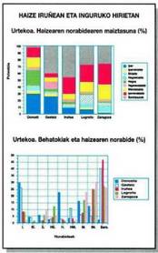 Horien atzetik datoz mendebalekoa eta ipar-mendebalekoa, %5-etik gorako balioekin. Ekialdeko haizeak ez du jotzen ia,eta hego-ekialdeko eta hegoaldeko haizeak ere gutxitan. Aipagarria da barealdien kopuru garaia, %40tik gorakoa; kopuru hori hain garaia izateko arrazoia behatokiaren kokaera da, sakonune batean baitago, mendiz babestua.Iruñeko datuen arabera haizearen urtekonorabideetan IM norabidea da nagusi(%25,1), eta I (%8,2), M (%7,2) eta HE(%4,4) ondoren. Barealdiak ugari dira(urteko datu orokorren %46a) Iruñeko arroa nahiko babesturik dagoelako orografiari dagokionez.Adanrikoko presio garaien gune batek eta Mediterraneoko ekairz batek eratzen dutena da ohiko egoera; egoera horretan haizeak iparretik jotzen du Gasteizen eta IM norabidea hattzen du Iruñean, uren banalerroa igarotzean.Gasteizen hegoaldeko haizeak dira indartsuenak; abenduan eta urtarrilean aipagarri dira hego-ekialdekoak eta urtarrilean hego-mendebalekoak; Atlantikoko ekaitz handiekin eta Mediterraneoko antizikloi batekin batera izaten dira bi mota horiek. Ipar haizeak indar handiz jotzen du maiatzean ere. Iruñean, haizearen lastertasunaren urteko batez bestekoa aski apala da, neurketak egiten dituen behatokia erliebe periferikoek babesten dutelako, eta biltzen diren datuak ez datozelako joera orokorrarekin bat. Egun ugaritan izaten dira barealdiak edo haize ahulak; lastertasun handieneko haizeak iparrekoak dira abenduan eta otsailean, ipar-mendebalekoak otsailean, eta hego edo hego-mendebalekoak azaroan.