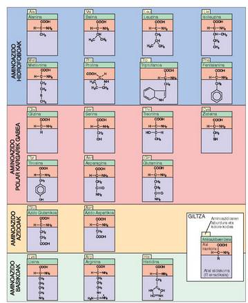 proteinak dira. Proteinak aminoazidoz osatuak dira. Aminoazido horietatik hogei ia